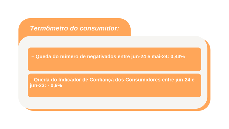 No âmbito do consumidor, o Indicador de Confiança da FGV mostrou uma melhora na avaliação da situação atual, embora as expectativas futuras tenham se deteriorado. O número de negativados diminuiu na comparação entre junho e maio de 2024, apresentando um crescimento modesto de 0,5% em relação ao mesmo mês do ano anterior.