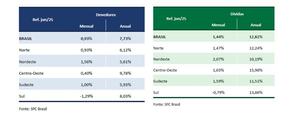 Quando se observa o número de dívidas em atraso por região, a maior alta anual em junho também veio do Centro-Oeste (15,98%), seguido por Sul (13,86%), Norte (12,24%), Sudeste (11,51%) e Nordeste (10,19%). A região Sul, por sua vez, mantém a menor proporção de negativados, com 37,59% de sua população adulta nesta condição, reforçando sua resiliência em meio ao cenário nacional.