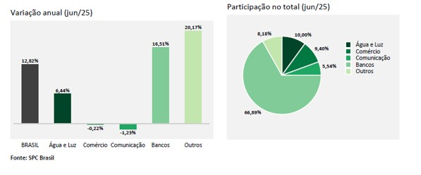 Ao analisar a evolução por setor credor, o segmento de Bancos destacou-se com o maior crescimento no número de dívidas em atraso, registrando um aumento de 16,51% na comparação anual de junho. Esse crescimento é ainda mais acentuado do que o de 14,37% registrado em maio. Os setores de Água e Luz (6,44%) também apresentaram crescimento. Em contrapartida, as dívidas com os setores de Comunicação (-1,23%) e Comércio (-0,22%) apresentaram uma leve queda no total de dívidas em atraso.