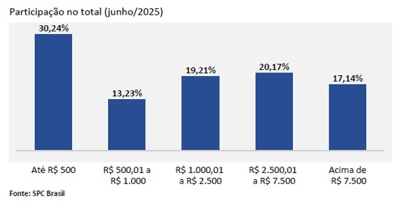 A distribuição das dívidas por valor, conforme o Análise Inadimplência BR e Regiões PF jun2025, mostra que quase três em cada dez consumidores (30,24%) tinham dívidas de até R$ 500. Esse percentual salta para 43,48% quando consideradas dívidas de até R$ 1.000, um comportamento muito similar ao de maio, evidenciando que grande parte da inadimplência se concentra em valores menores, mas que impactam significativamente o orçamento familiar.