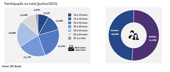 Em relação à faixa etária, a maior participação de devedores no Brasil em junho foi do grupo de 30 a 39 anos, representando 23,70% do total de inadimplentes. Essa faixa etária concentra cerca de 17,62 milhões de pessoas negativadas, o que significa que mais da metade (51,91%) dos brasileiros nesse grupo etário estão com o nome em cadastros de devedores. A distribuição por sexo se mantém equilibrada, com 51,15% de mulheres e 48,85% de homens entre os devedores, mantendo a idade média em 44,8 anos.