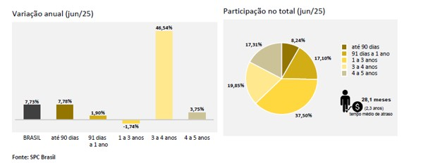 A análise aprofundada dos dados de junho de 2025 revela características marcantes sobre o perfil do inadimplente brasileiro. O crescimento do indicador anual de devedores, de 7,73%, está fortemente concentrado no aumento de inclusões de consumidores com tempo de inadimplência entre 3 e 4 anos, registrando uma variação expressiva de 46,54%. O tempo médio de atraso das dívidas no Brasil é de 28,1 meses (aproximadamente 2,3 anos), um leve aumento em relação aos 27,9 meses de maio.