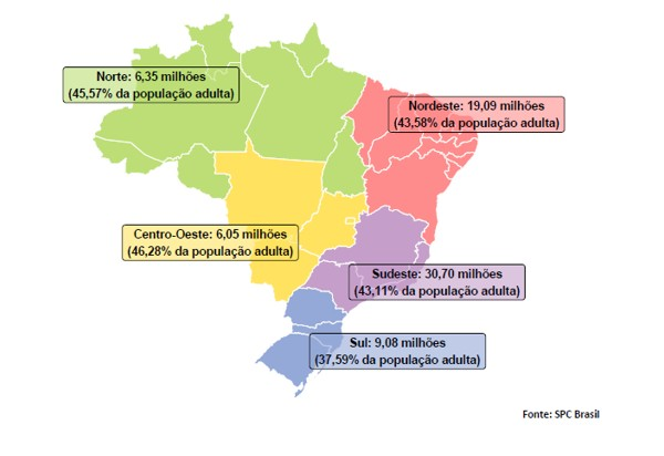 A análise regional da inadimplência de pessoas físicas revela disparidades importantes. Em junho de 2025, o Centro-Oeste apresentou a alta mais expressiva no número de inadimplentes na comparação anual, com crescimento de 9,78%, superando o já alto índice de 8,19% de maio. Em termos de percentual da população adulta, a região também lidera, com 46,28% de seus habitantes incluídos em cadastros de devedores. As demais regiões seguiram com aumentos anuais significativos: Sul (8,03%), Norte (6,12%), Sudeste (5,93%) e Nordeste (5,61%).