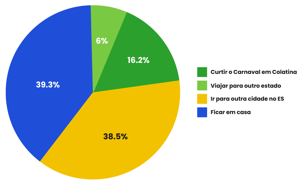 Os dados apontam que uma parcela significativa da população não permanecerá em Colatina durante o Carnaval. Entre os respondentes, 38,5% afirmaram que pretendem viajar para outra cidade dentro do Espírito Santo, enquanto 6% planejam viajar para outros estados. Por outro lado, 39,3% declararam que ficarão em casa e 16,2% pretendem curtir o Carnaval em Colatina.